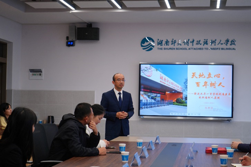 随后举行的见面交流会暨“衡阳师范学院教育实践基地”授牌仪式上,陈赛强校长致欢迎辞,并作《“天地立心,百年树人”——新建九年一贯学校优质发展的双语树人实践》主题报告,从领导关怀、集团支撑、办学目标、办学特色等方面,详细介绍了树人学校在优质发展道路上的探索,重点阐释“一体两翼四维度”办学宗旨,全面展示树人学校的办学成果与发展蓝图。仪式由白容副校长主持。